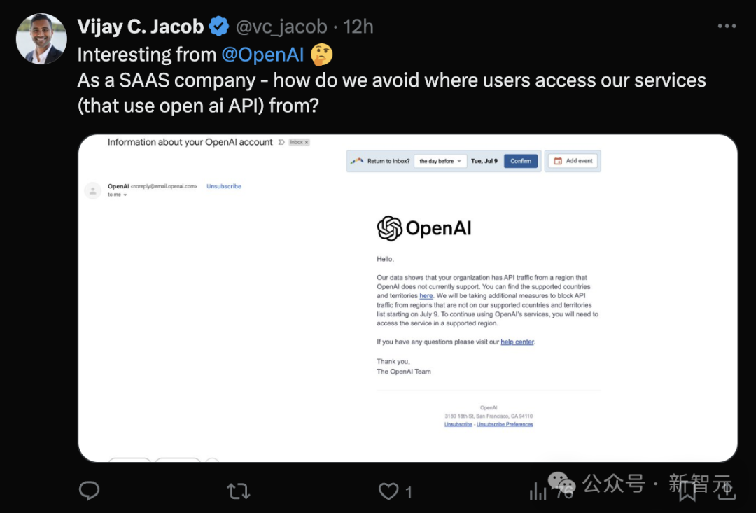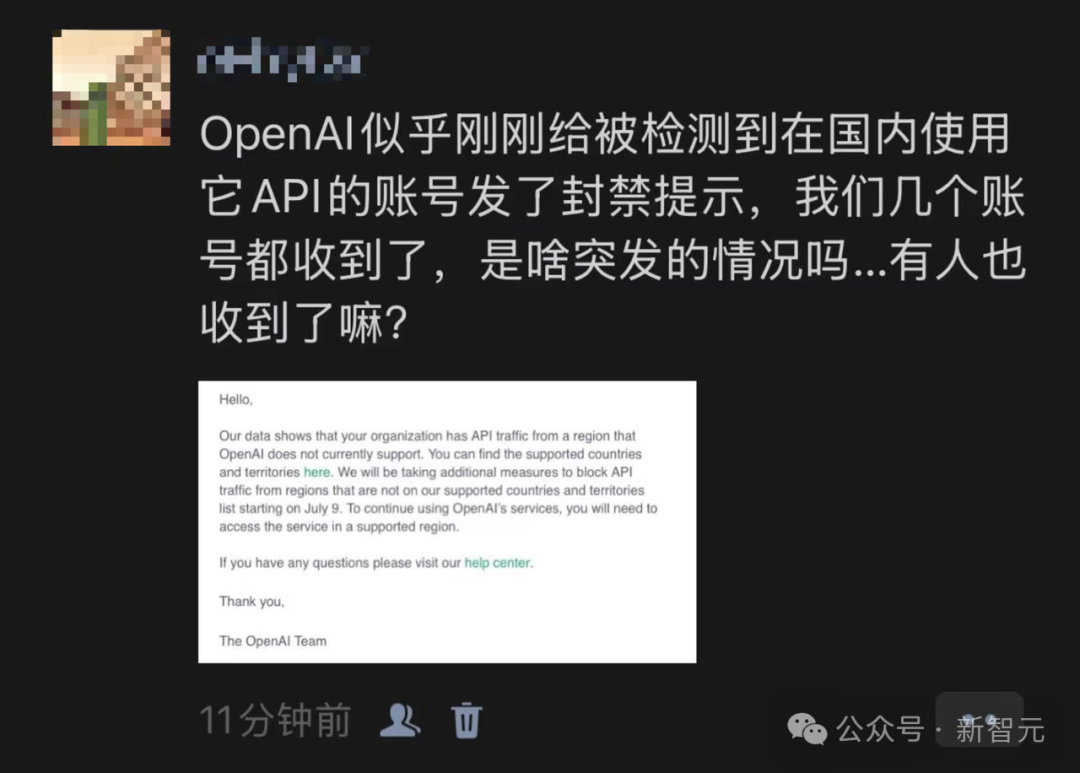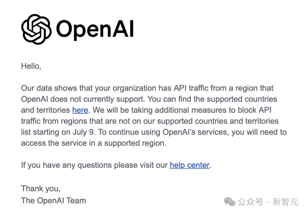 今日凌晨,世界各地的开发者纷纷收到来自OpenAI的警告信,称从7月9日起将开始封禁在不支持地区使用的API。