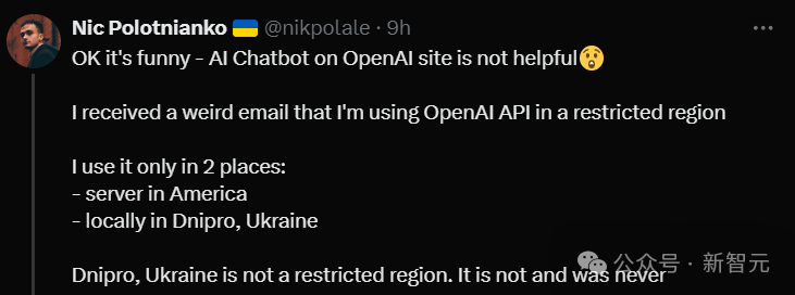 还有一位使用过OpenAI API的网友也收到了这封邮件,但服务器在美国,个人电脑在第聂伯罗,跟受限国家和地区的列表根本不搭边。