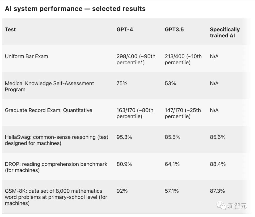 根据技术报告,GPT-4在其中大部分测试中都取得了优异成绩。