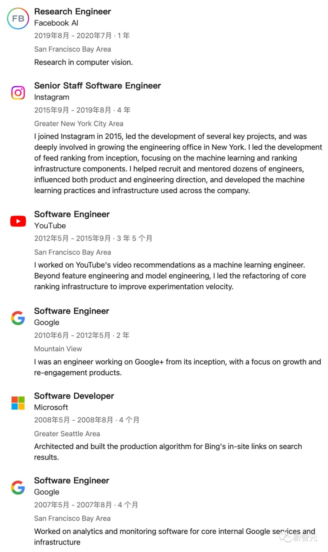 他本人丰富经历,遍布许多实验室Facebook AI、Instagram、YouTube、谷歌、微软。