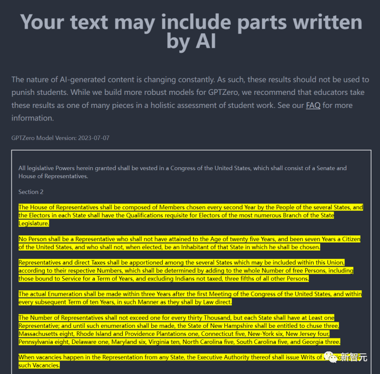 GPTZero的创建者Edward Tian说,「《美国宪法》是一个反复输入到许多大型语言模型训练数据中的文本。