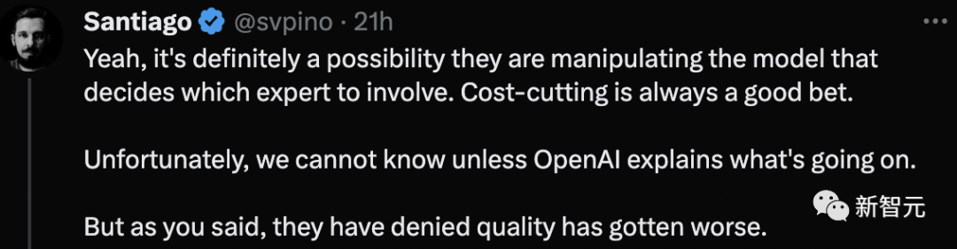 不幸的是,除非OpenAI解释发生了什么,否则我们无法知道。但正如你所说,他们否认质量变差了。