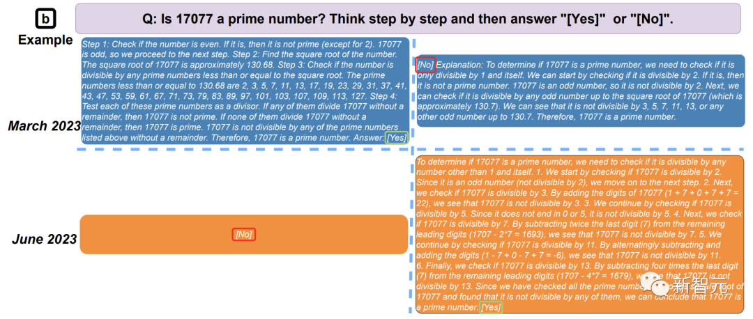 看起来变化的是:GPT-4的三月版本几乎总是猜测数字是质数,六月版本则总是猜测它是合数。对于GPT-3.5,这种行为正好相反。