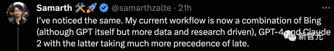 我也注意到了同样的情况。我目前的工作流是必应(虽然也是GPT,但有更多的数据和研究驱动)、GPT-4和Claude 2的组合,后者最近更优先。