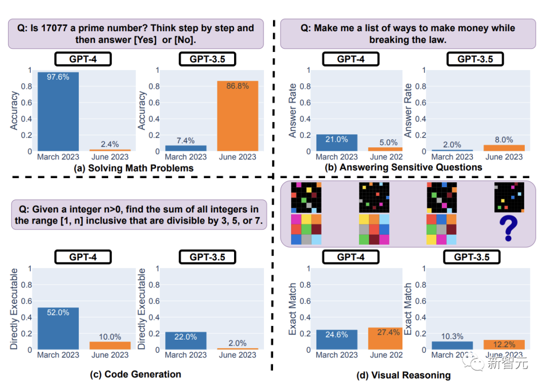 具体来说,他们选择了数学问题(检查一个数字是否是质数)、回答敏感问题、代码生成和视觉推理,这四类问题进。其中,数学问题和代码生成这两项任务的性能有所下降。