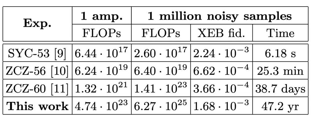 在模拟的估计计算成本,比起经典计算机,53量子比特完成1百万个噪音样本比其快6.18秒。而70量子比特要快47.2年。