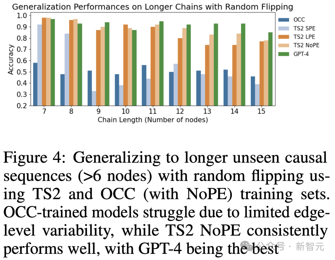 虽然训练时只用到了长度为3~6个节点的因果链,但序列长度为7~13时,TS2(NoPE)在标准和随机翻转的链上,获得了比GPT-4更高或相当的准确率。