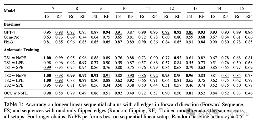 需要注意的是,随机预测会得到50%的准确率,这表明通过公理化训练的TS2(NoPE)模型,能够将其推理能力泛化到更长的序列上。