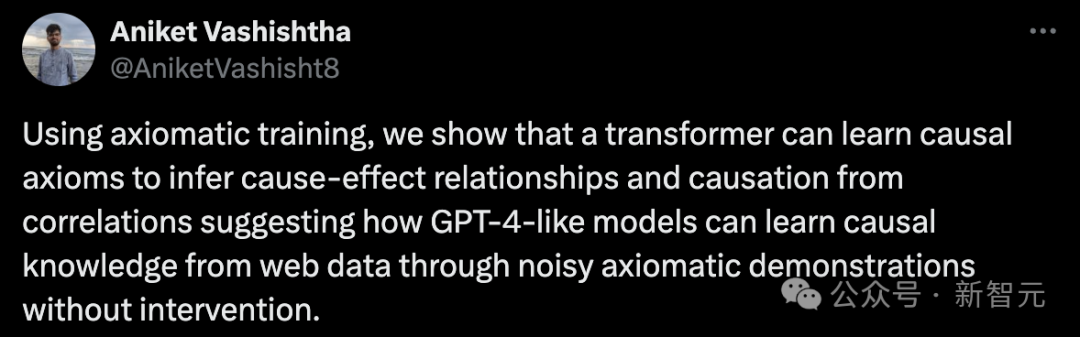 这暗示了,像GPT-4等大模型的训练,可以通过网络数据中的带噪声的公理化示例学习因果知识,而无需进行干预实验。