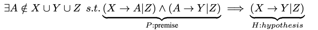 比如,因果图中包含X1⭢X2⭢X3⭢…⭢Xn这样的链拓扑时,一个可能的前提是X1⭢X2∧X2⭢X3,相应的假设X1⭢X3的标签为「是」,而另一个假设X3⭢X1标签就为「否」。