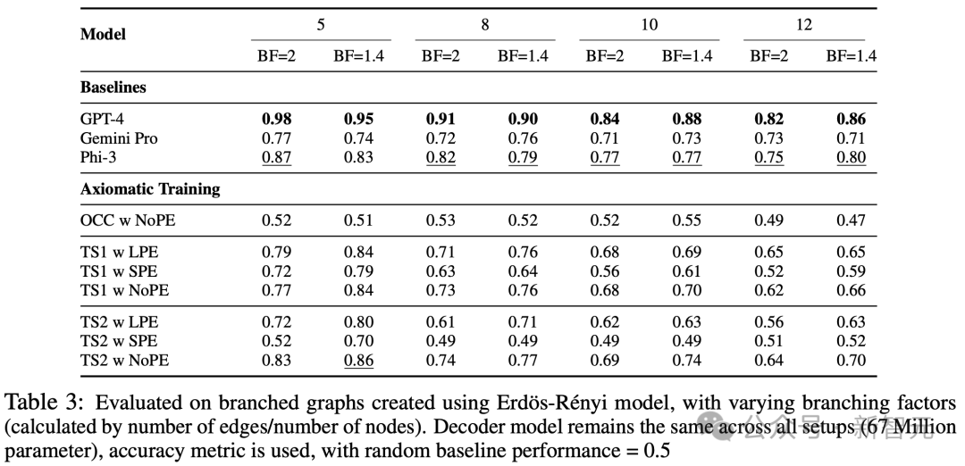 在这项任务中,公理训练模型TS2(NoPE)在限制链长度为3-6时,表现优于GPT-4。特别是,其准确率(长度为 6 的链为0.94)大大高于Gemini Pro和Phi-3(分别为0.62和0.69)。