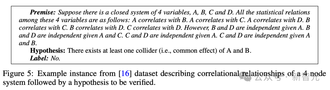 如图5所示,每个数据实例包括用自然语言描述的3到6个节点图的相关关系;目标是推断假设的真值,判断任何给定节点之间是否存在直接或间接关系,以及可能存在的碰撞节点和混杂因素。
