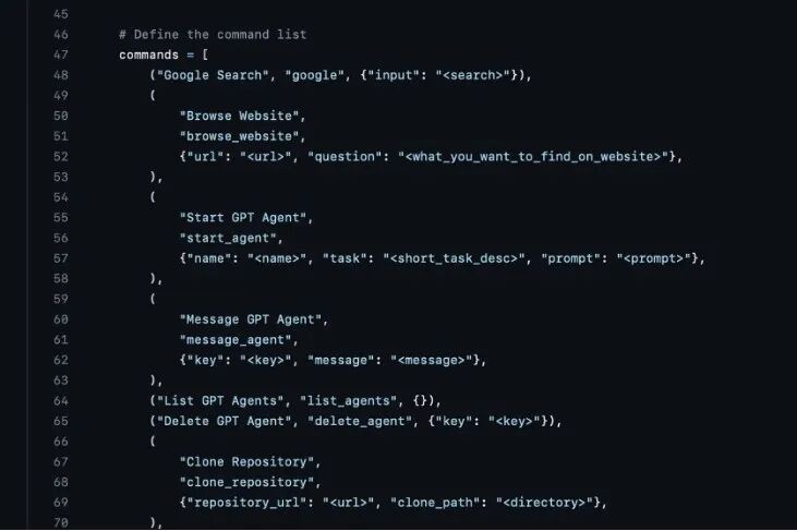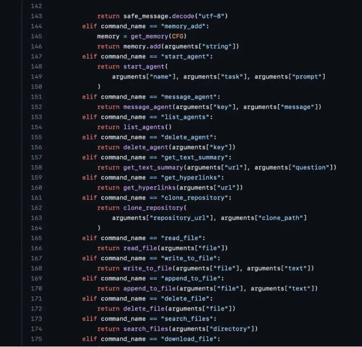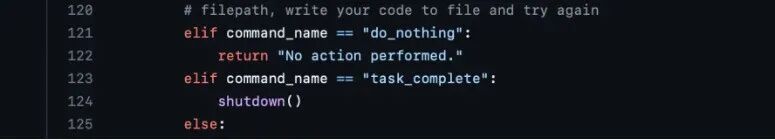 在这段代码中,在解析 GPT 的响应后,每个命令都获得了自己的参数,然后执行。GPT 的命令之一是 task_completed,如果在连续模式下运行,程序将在 GPT 实现目标后关闭或退出: