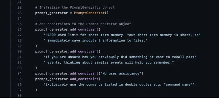在对话刚开始的时候,Auto-GPT 使用“系统”角色来配置约束,并进行自我绩效评估。Auto-GPT 有一个提示生成器,其中一些约束是硬编码的: