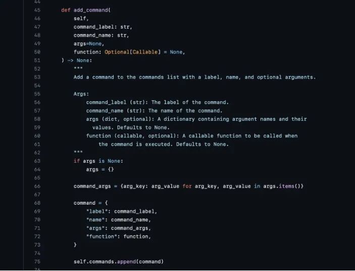自主代理要想真正发挥作用就必须能够完成实际的工作,并与现实世界交互,比如文件系统或互联网等。Auto-GPT 必须编写能授权 GPT 执行的每个命令,在生成约束和自我评估的初始提示时,还可以提供可执行命令及其参数的列表。下面是将命令添加到提示符的类函数: