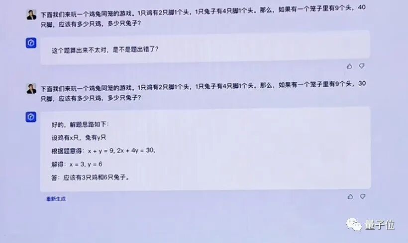不过在现场,文心一言处理的数学问题不算复杂,是小学数学竞赛常见的鸡兔同笼问题。