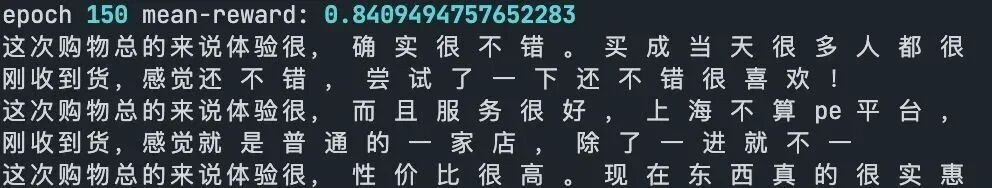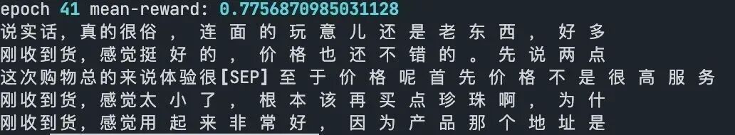 每当模型生成一个句子,我们就给出一个相应的得分(reward),用于表征该条生成评论是否是「正向好评」,如下所示: