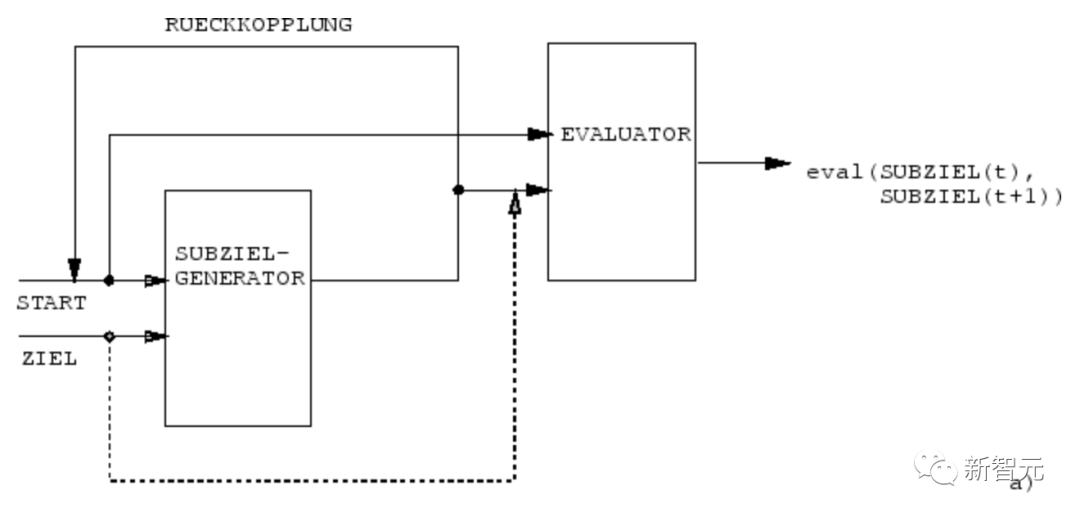 一个RL机器得到额外的命令输入,其形式为(开始,目标)。一个评估器NN学习预测从开始到目标的当前奖励/成本。一个基于(R)NN的子目标生成器也看到了(开始,目标),并使用评估器NN的(副本)通过梯度下降学习一连串成本最低的中间子目标。RL机器试图使用这种子目标序列来实现最终目标。