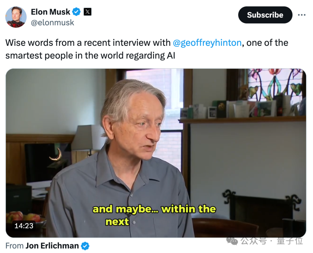 值得一提的是,被Hinton“开除朋友籍”的马斯克还在推特上转发了电视专访的内容。