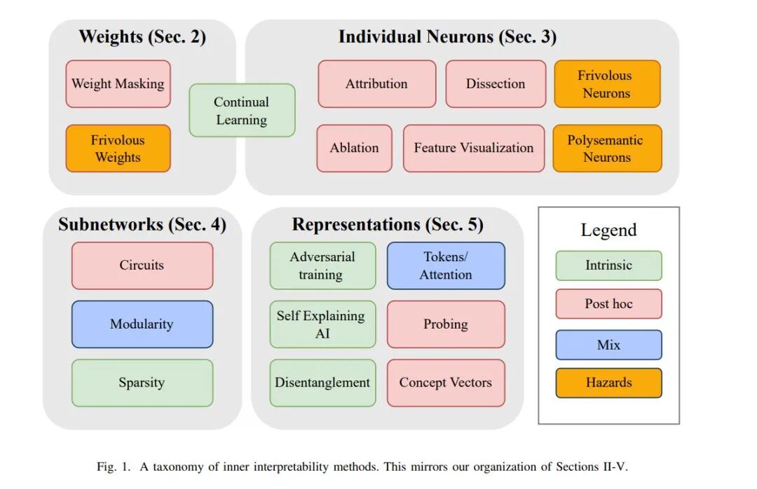 我们的重点是DNN的内部可解释性方法。值得注意的是,模型无关技术、黑箱技术、输入归因方法、神经符号方法和“优秀的老式AI”超出了本次综述的范围。这并不是说它们在构建安全人工智能方面的价值低于我们所关注的方法——我们相信多样化的技术是至关重要的。然而,我们专注于内部可解释性方法(1),因为该综述的可跟踪范围,(2) 因为它们对某些目标(如理解如何修改模型、反向工程解决方案,以及检测通常不会出现在系统部署行为中的潜在知识)有很好的装备。也请参阅之前对可解释性工作的一些调查和评论,它们与我们的[3],[58],[60],[68],[95],[118],[136],[173]-[175],[208],[215],[218],[219]有重叠。然而,这项综述的不同之处在于其对内部可解释性、人工智能安全以及可解释性和其他几个研究范式之间的交叉的关注。参见我们在第VI节的讨论。在接下来的章节中,我们根据DNN的计算图解释的部分来组织我们对技术的讨论: 权重、神经元、电路或表示。图1描述了内部方法是如何这样组织的。除了这种分解,可解释性技术还可以按照它们是在模型训练期间使用还是在模型训练之后使用来划分。内在可解释性技术包括训练模型,使其更容易学习或具有自然的解释。Post hoc技术的目的是在模型经过训练后对其进行解释。我们在分段层次上根据方法是内在的还是事后的来划分方法。这两种方法并不相互排斥。