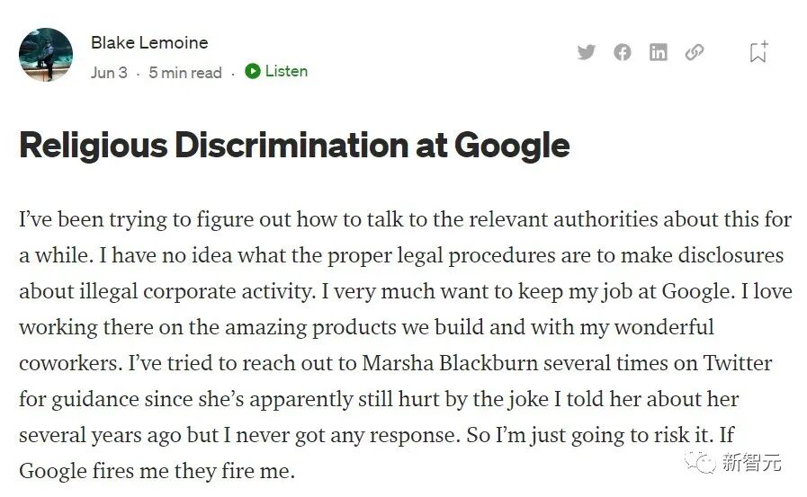 但遗憾的是,Blake与LaMDA的故事似乎并没有那么纯粹。