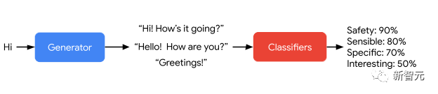 在对话过程中,LaMDA生成器首先根据当前的多轮对话环境生成几个候选反应,LaMDA分类器预测每个候选回应的安全和质量(SSI)分数。其中,分数低的候选回应首先被过滤掉,剩余的候选者按其SSI分数重新排序,并选择最重要的结果作为回应。