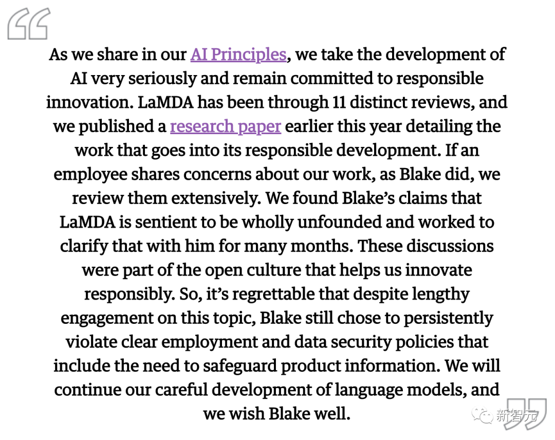 如果有员工像Blake那样分享对我们工作的担忧,我们会广泛地审查。我们发现Blake关于LaMDA是有生命的说法是完全没有根据的,并与他一起努力澄清了好几个月。这些讨论是帮助我们负责任地进行创新的开放文化的一部分。