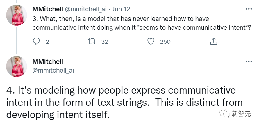 玛格丽特·米切尔(Margaret Mitchell)在呼吁组织内部缺乏多样性后被谷歌解雇,她在推特上写道,像LaMDA这样的系统不会产生意志。相反,它们是在「模拟人们如何以文本字符串的形式表达交流意图的。」