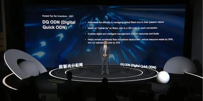 第三项:数智光分配网。光纤的无源特性,导致其管理非常困难。这项专利通过在光纤上刻写光虹膜,作为光纤的生物标签,帮助运营商加速光纤宽带部署,减少30%的资源浪费,降低20%的运营成本。