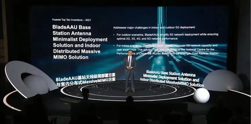 第八项:BladeAAU 和 Massive MIMO方案。这项发明解决了室内外 5G 部署的关键挑战。在室外,BladeAAU 助力客户极简部署 5G 网络并同时保证不同制式的网络性能最优;在室内,分布式 MIMO 技术可大幅提升 5G 网络容量和用户体验。