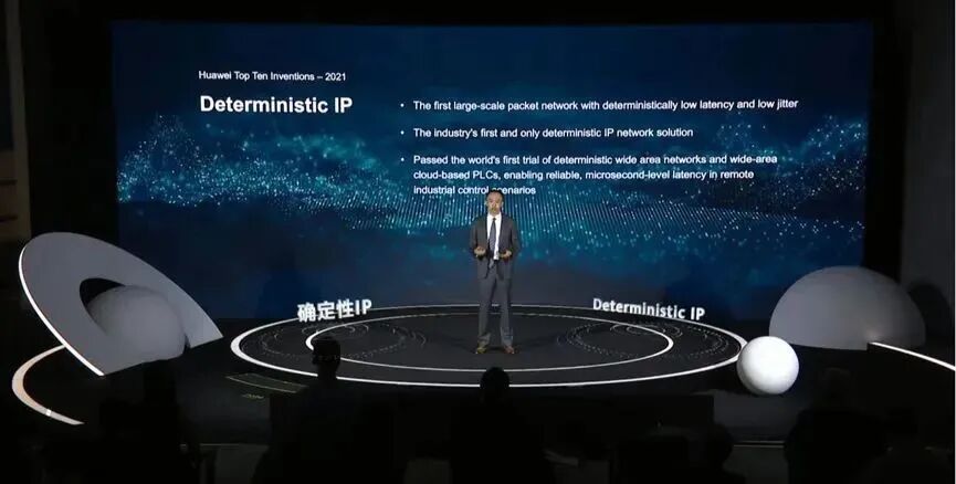 第六项:确定性IP。这项发明实现了大规模分组网络的确定性低时延、低抖动。基于这一发明,华为发布了确定性 IP 网络解决方案,实现了微秒级精度的远程工业控制。