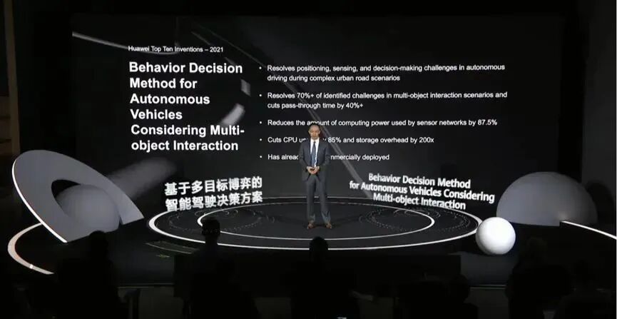 第二项:基于多目标博弈的智能驾驶决策方案。这项发明解决了自动驾驶里的一些关键挑战,包括城市道路人车混杂的复杂场景里的定位、感知及决策问题。这项发明解决交互场景接管难例超过70%,缩短通行时间40%,减少存储开销200倍,降低算力消耗超过85%。