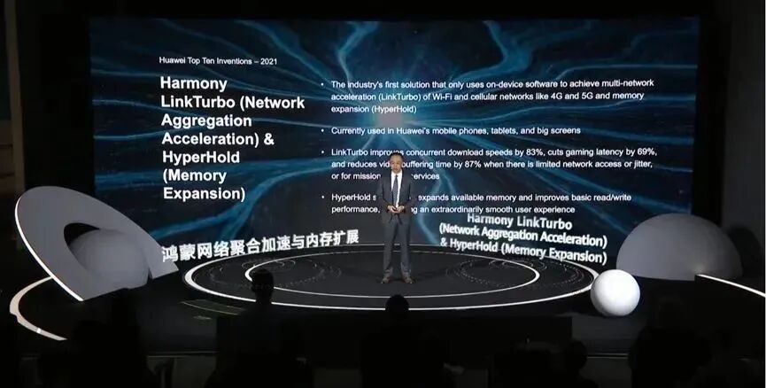 第十一项:鸿蒙网络聚合加速与内存扩展。该发明是一个纯终端侧加速组合。利用该专利,智能手机可以在各种网络和内存使用情况下,为用户带来流畅体验。LinkTurbo 显著提升并发下载速率,降低游戏时延和视频缓冲时延,而 Hyperhold 可大幅扩展可用内存并提升基础读写性能。