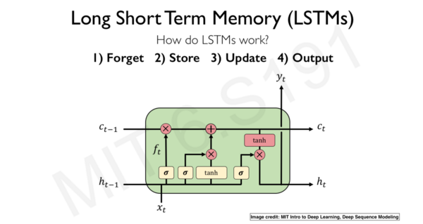 LSTM 架构。图片取自 MIT 的课程《6.S191 Introduction to Deep Learning》
