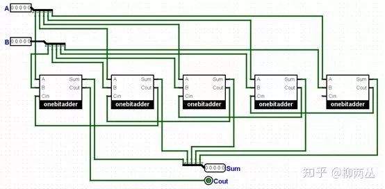 他把黑盒子里的零件全拿了出来,四人忙碌地工作着。很快,他们拥有了5个全加器,基于小红的设计连了起来: