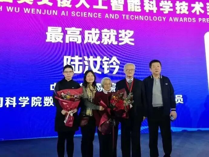 2018年,中国人工智能最高荣誉“吴文俊人工智能最高成就奖”颁奖现场,陆汝钤院士(右二)携家人出席。/图片由受访者提供