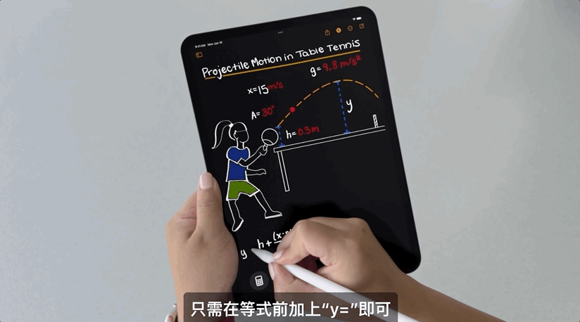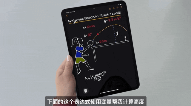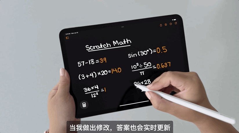 用Apple Pencil写一个数学表达式,写下等号的一瞬间,计算器就自动算出结果。