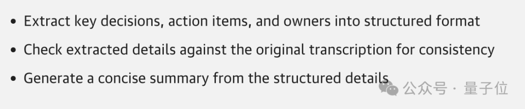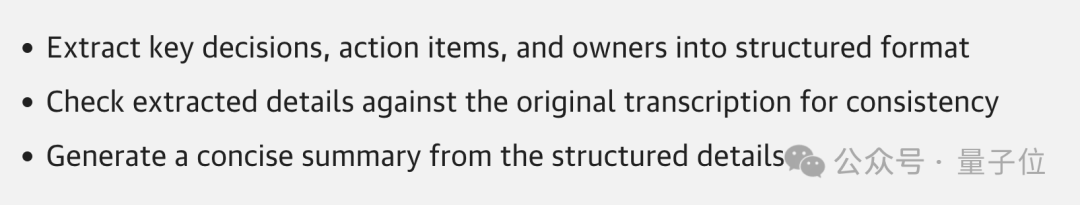 那么正确的做法是什么呢?提示词也应该像代码一样保持简洁,以会议记录总结场景来说,可以分解为以下步骤: