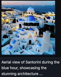 这张图的Prompt是,“蓝色时刻圣托里尼岛的鸟瞰图,展示了令人惊叹的建筑”。