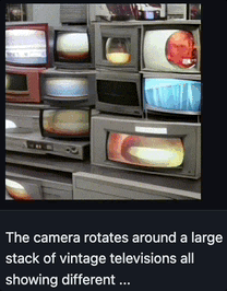 这张图的Prompt是,“摄像机对准一大堆老式电视机,所有电视机都显示不同的画面”。