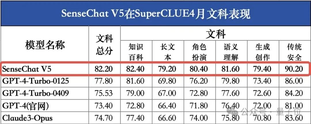 SenseChat V5在文科上的成绩依然是打破了国内大模型的纪录——