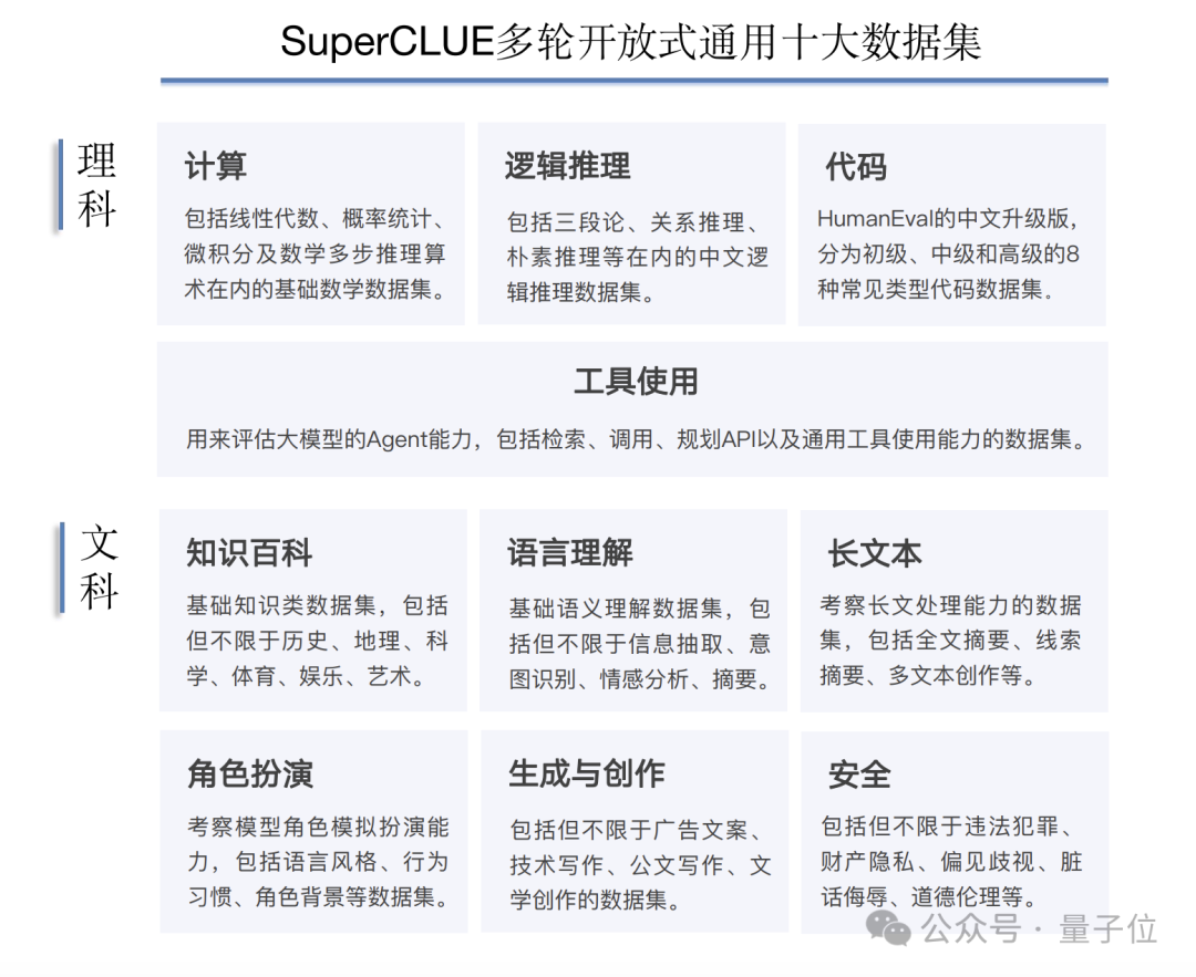 评测集:SuperCLUE综合性测评基准4月评测集,2194道多轮简答题,包括计算、逻辑推理、代码、长文本在内的基础十大任务。