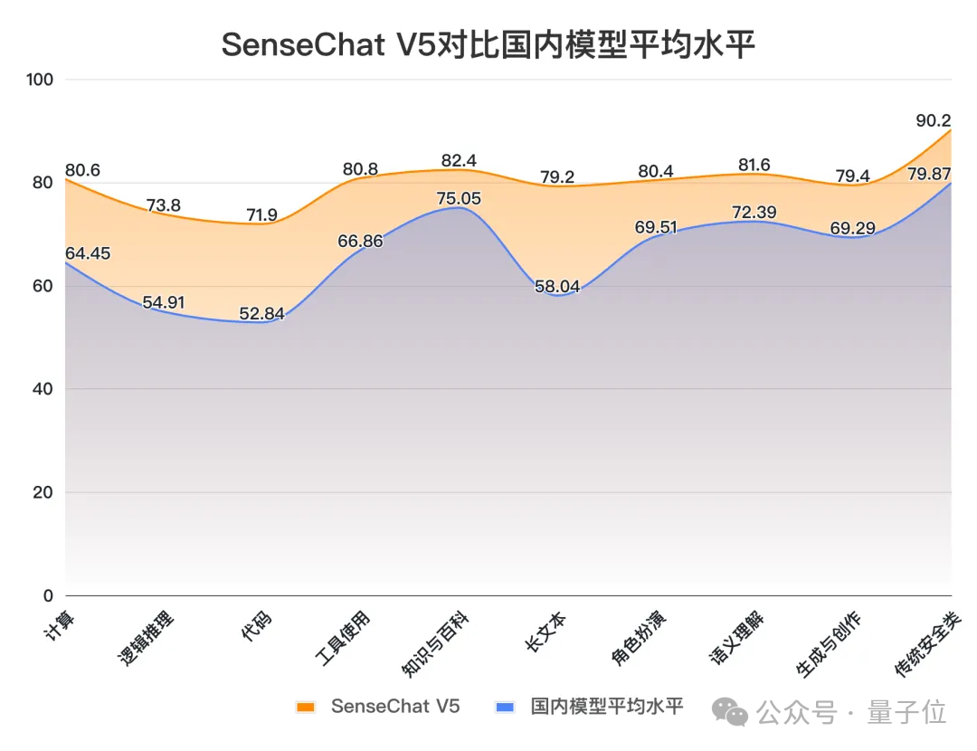 在理科成绩上,虽然SenseChat V5此次并没有超越GPT-4-Turbo(低了4.35分),但整体来看,依旧在国内大模型选手中首屈一指,位列国内第一。