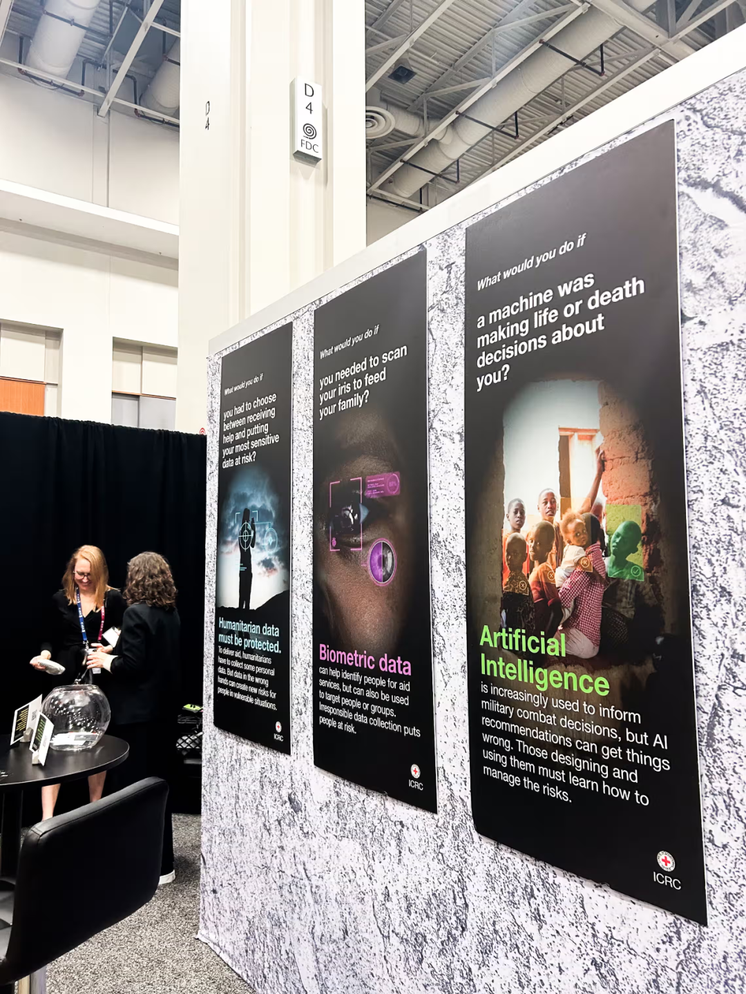 接下来我看到了一个小小的沉浸式展位,在灰色墙体上张贴着关注普通民众受到战争影响的海报。这里就是国际红十字会的地盘。