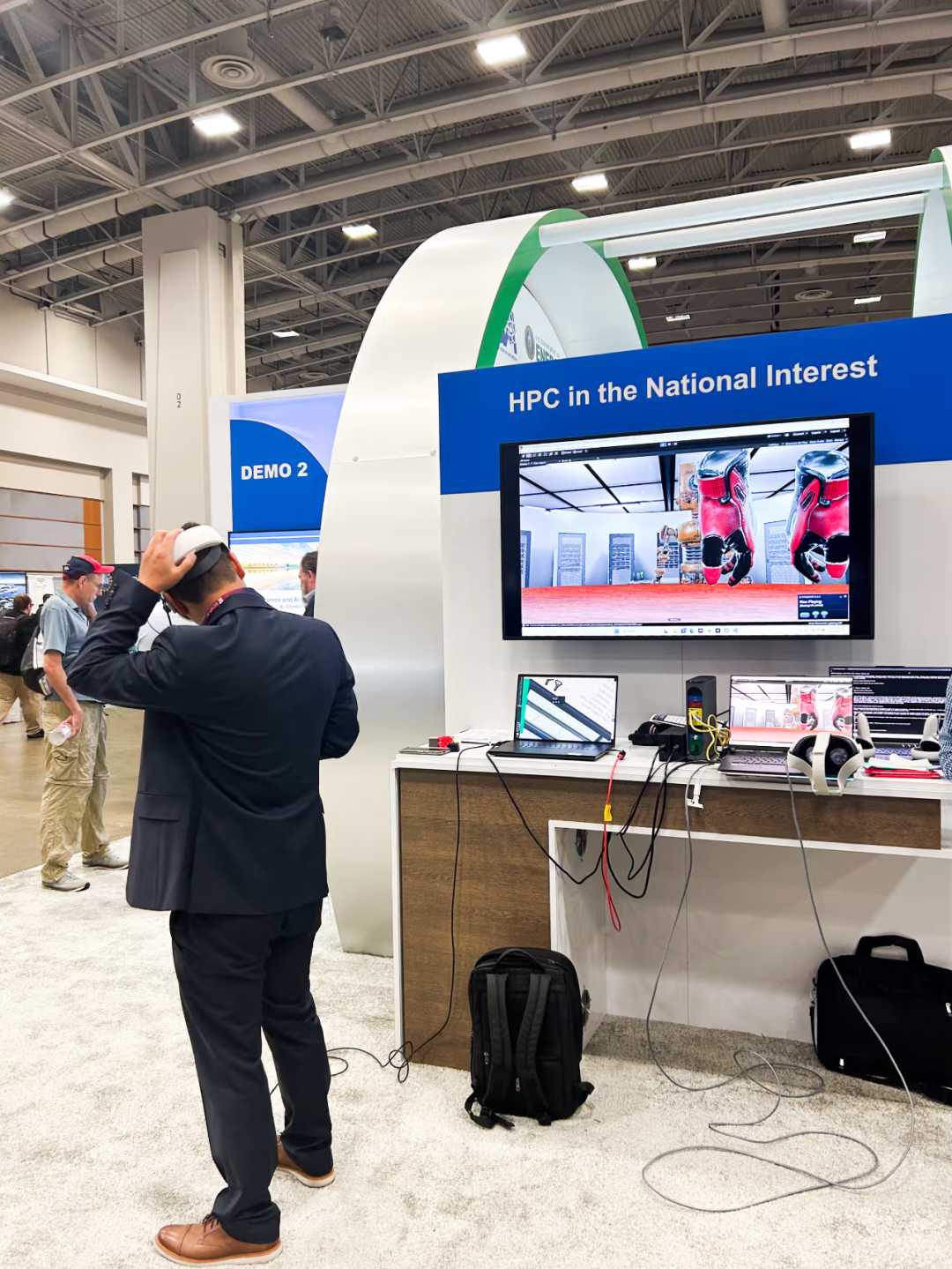 在 Palantir 巨大的主展位中,我试着戴上 VR 头显来测试 Palantir 为士兵们提供的新型增强现实工具。有人告诉我,我可以在正常观察身边环境的同时指挥卡车或者无人机。但在戴上头显后,我发现自己的视野很不稳定而且会失焦。