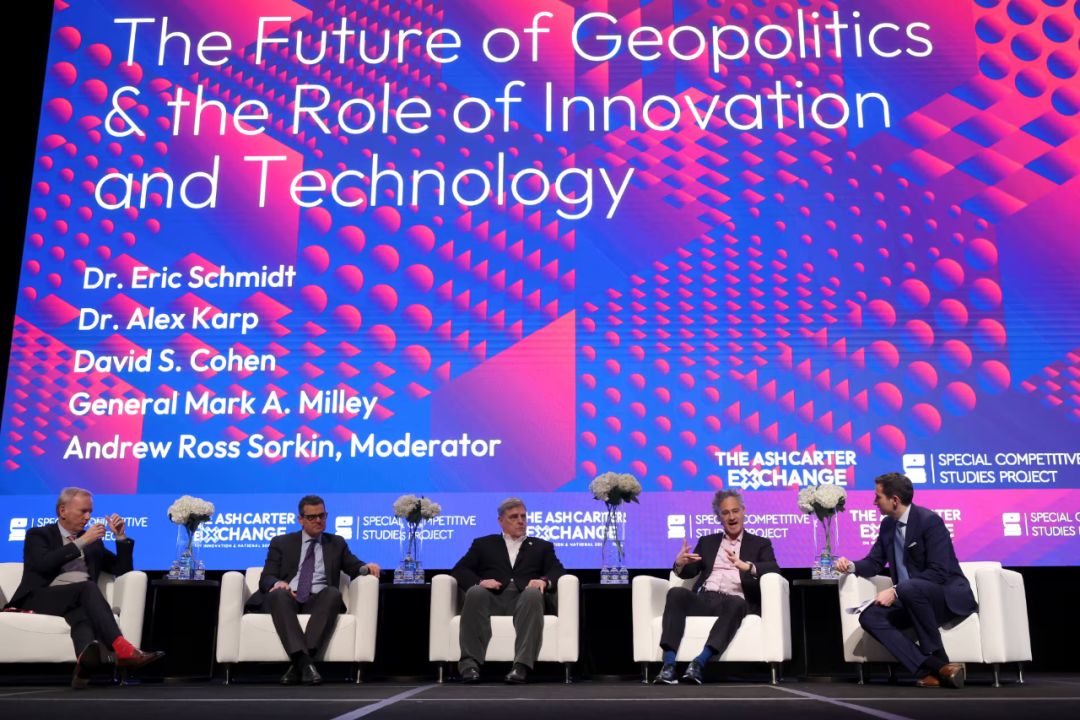 Eric Schmidt、David Cohen、Mark Milley 将军、Palantir 公司 CEO Alex Karp 以及 Andrew Ross Sorkin 齐聚小组讨论现场