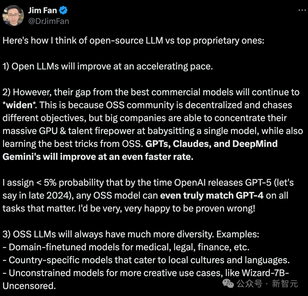 目前这种开源和闭源模型差距越来越大的趋势,Jim Fan曾在去年6月就做出过类似的预测。