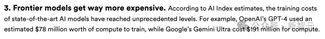 想要不断提升大语言模型的能力,算力成本是更大的挑战。根据斯坦福大学发布的2024年人工智能指数报告,训练GPT-4的计算成本约为7800万美元,Gemini Ultra则是一亿九千一百万美元左右。