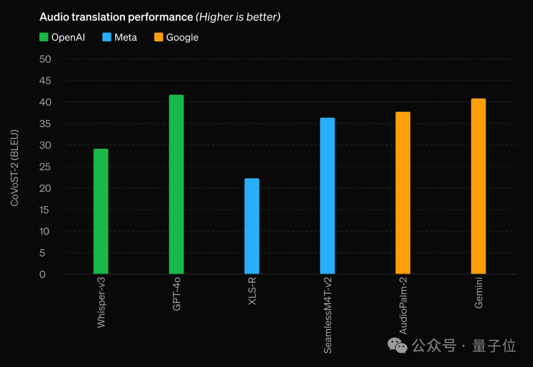 在语音翻译任务上,强于OpenAI专门的语音模型Whisper-V3以及谷歌和Meta的语音模型。