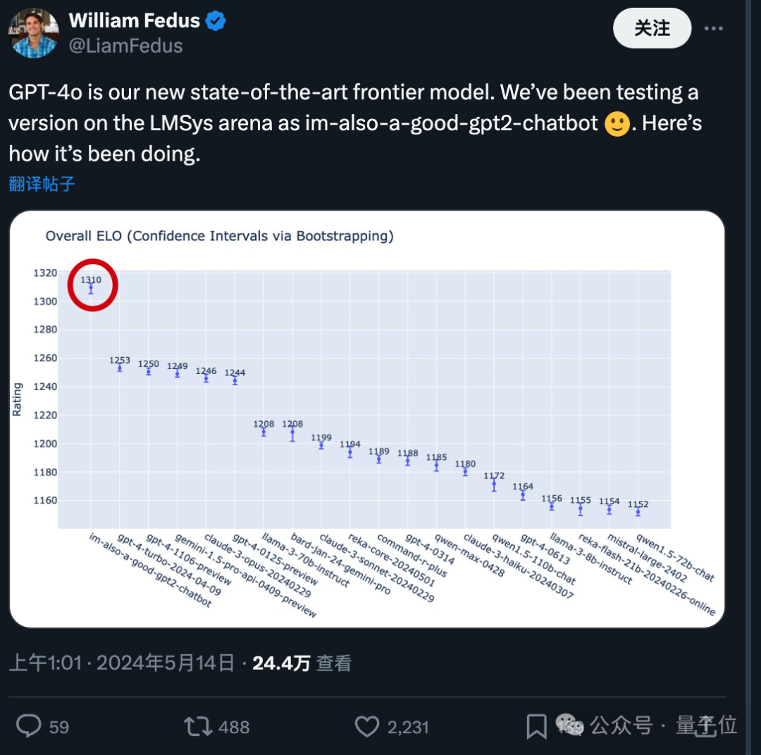 在场外,研究员William Fedus揭秘,GPT-4o就是之前在大模型竞技场搞A/B测试的模型之一,im-also-a-good-gpt2-chatbot。